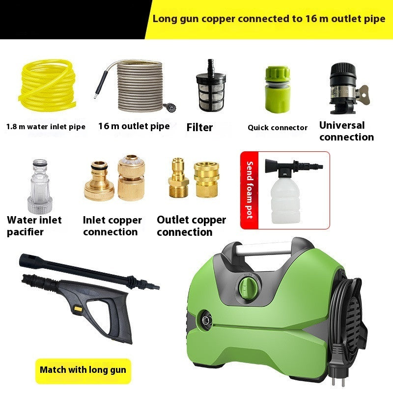 1.8 meter inlet pipe*1 16 meters outlet pipe filter *1 Quick connector*1 Universal joint *1 Foam pot *1 Water inlet nipple*1 Inlet Copper Connection*1 Copper connection for water outlet*1 Lance*1 Car Wash*1