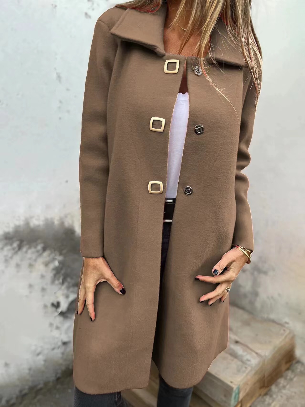 Women's Solid-color Mid-length Wool Coat With A Single-breasted Design
