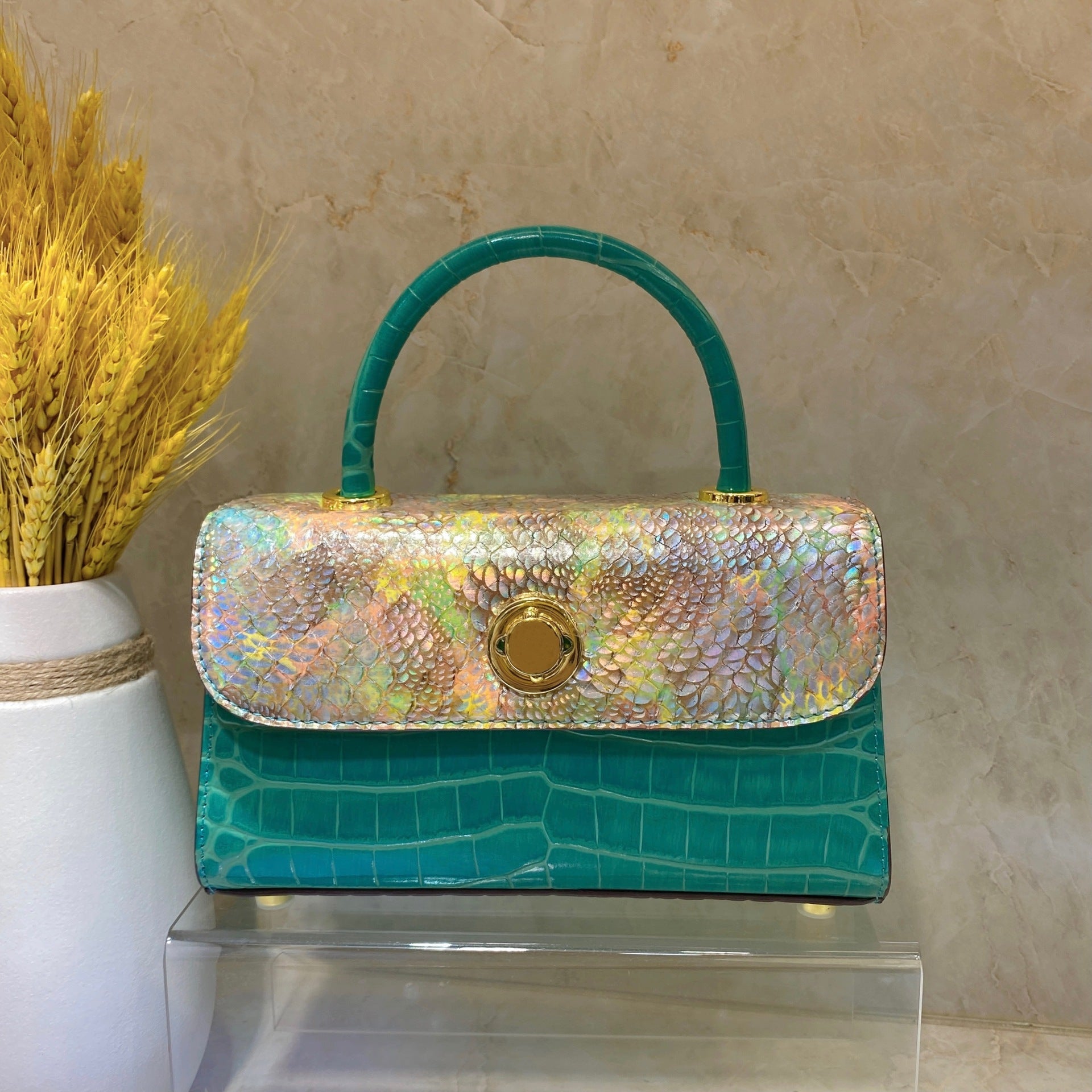 Matériau : cuir de vachette importé motif crocodile, avec peau de python importée, accessoires de quincaillerie de haute qualité