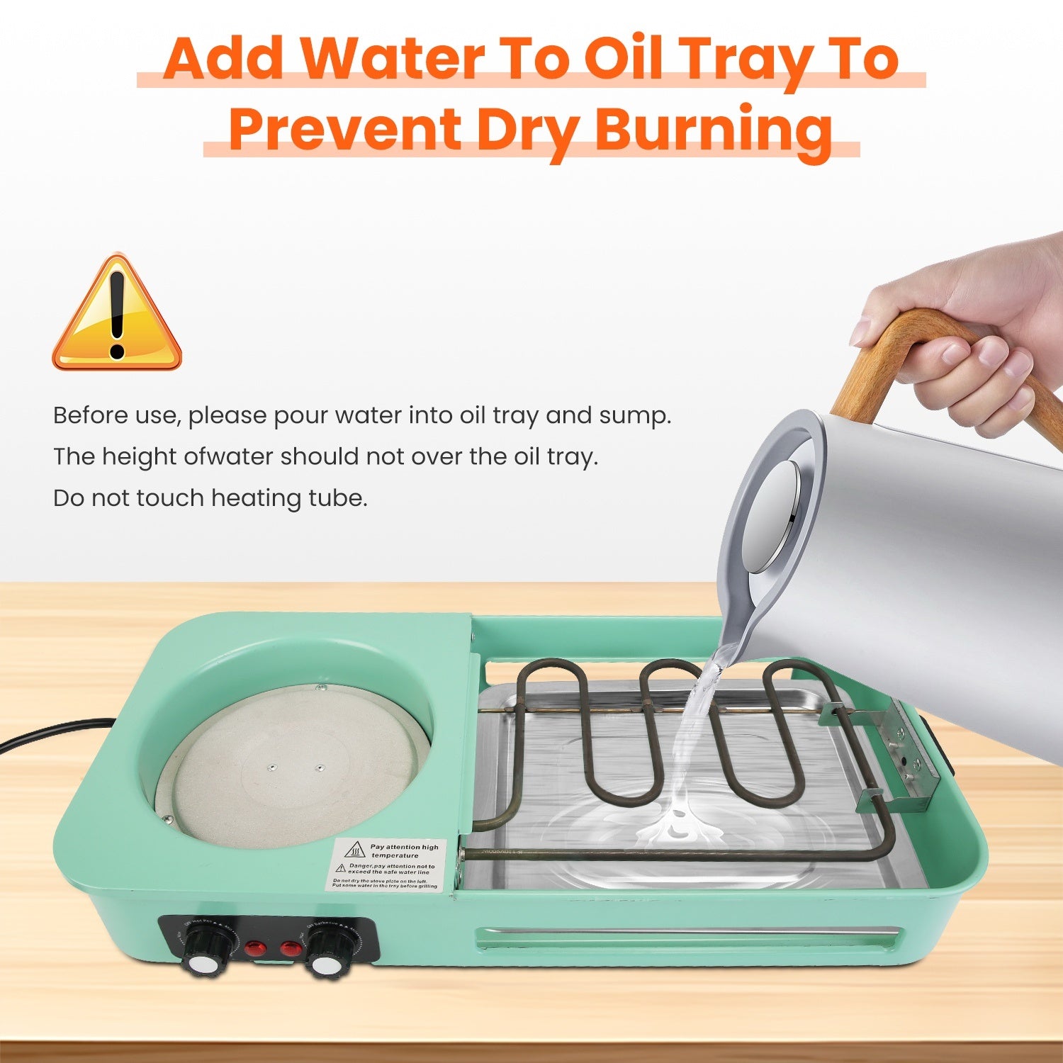 - *Non-Stick & Smokeless*: Both of hot pot and frying pan are featured with non-stick coating,contains no harmful chemicals,produces less smoke and requires few oil,so as to brings you low-oil,low-calorie,and low-fat meal,embracing a refreshing healthy lifestyle. Included oil tray can collect excess food fat and oil.