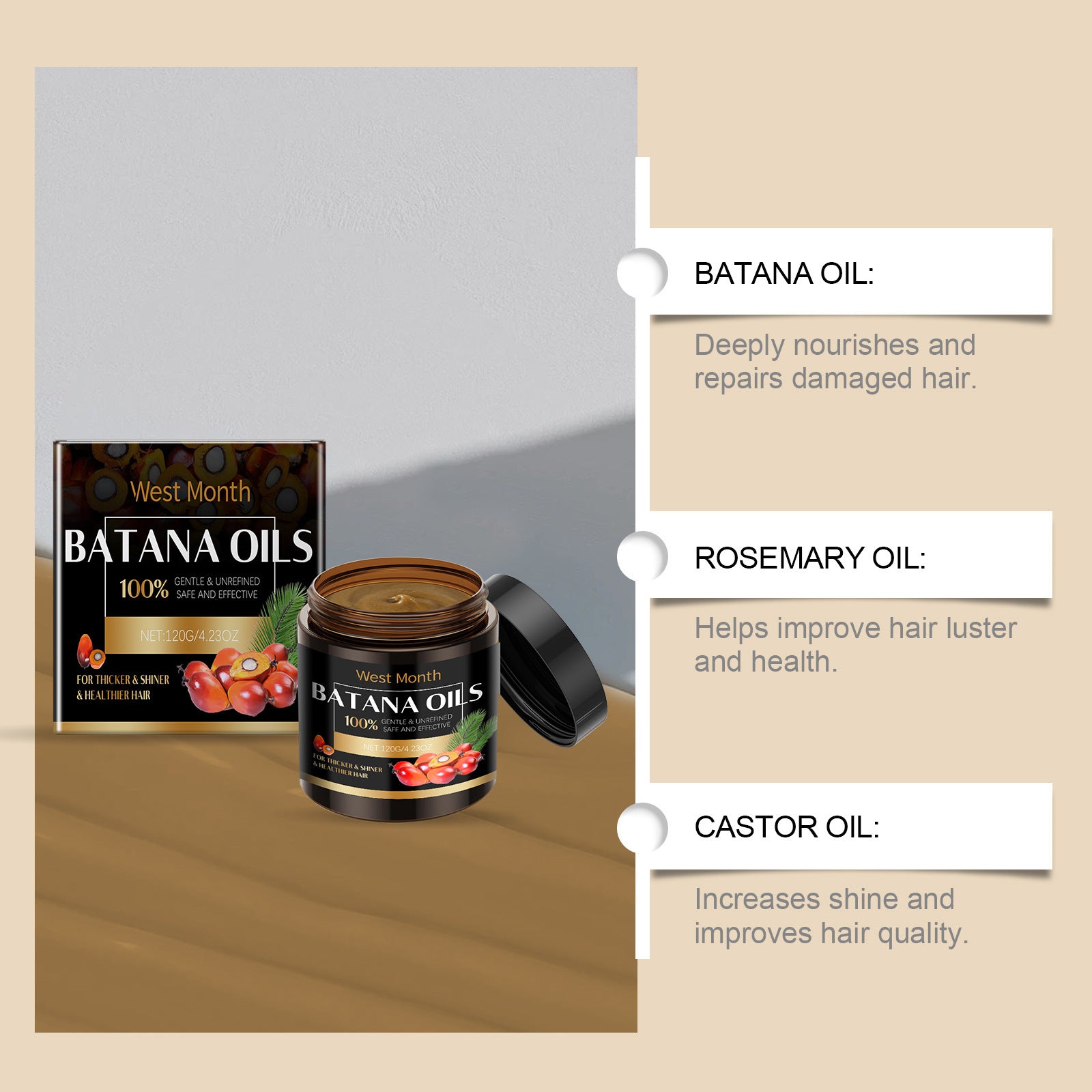 Ingredients: Batana oil, rosemary oil, mint extract, castor oil, glycerin