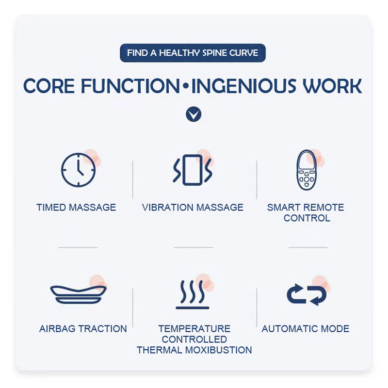 1. Intelligent pneumatic traction function, overcharge protection, through electronic control of airbag expansion, the long distance is 10cm, to achieve rhythmic extension of the waist up and down, and gradually shape normal and healthy psoas muscle bending;