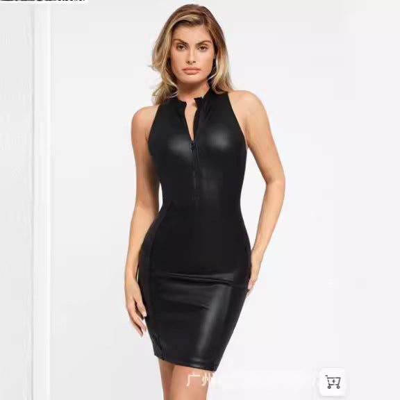 European and American women's clothing 2024 spring and summer new sexy American sleeveless hip-wrapped slim fit high elastic temperament leather dress
