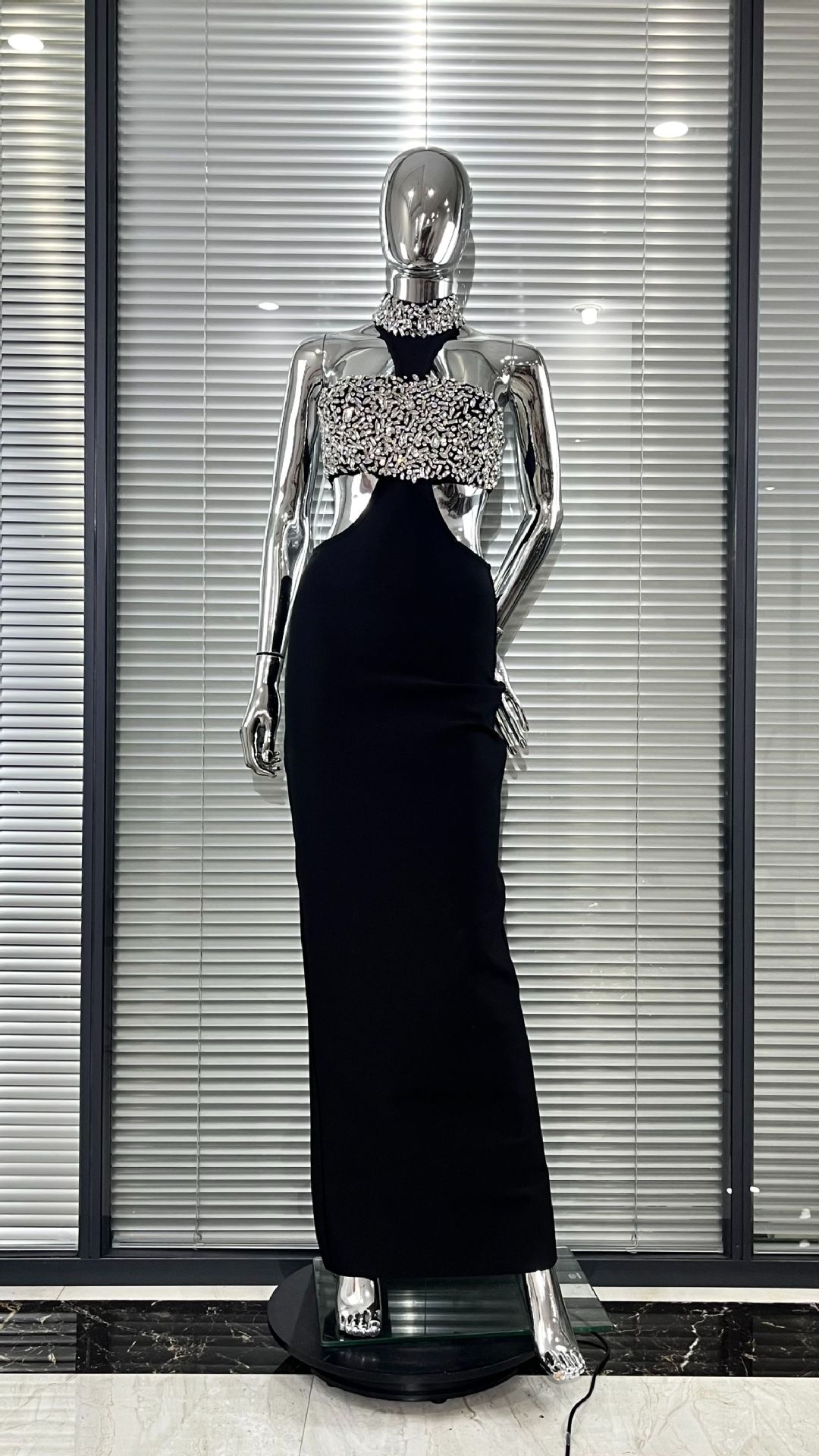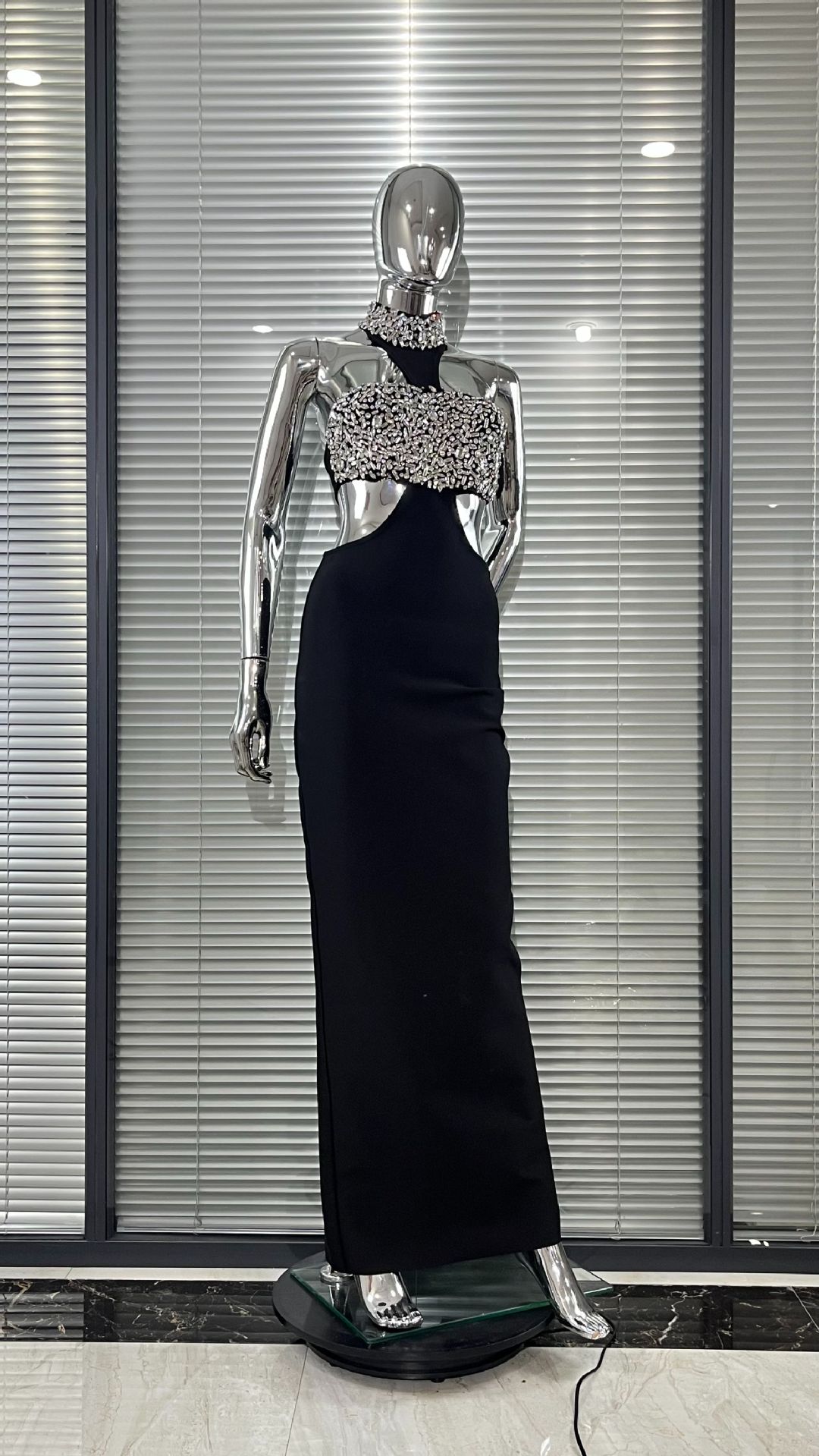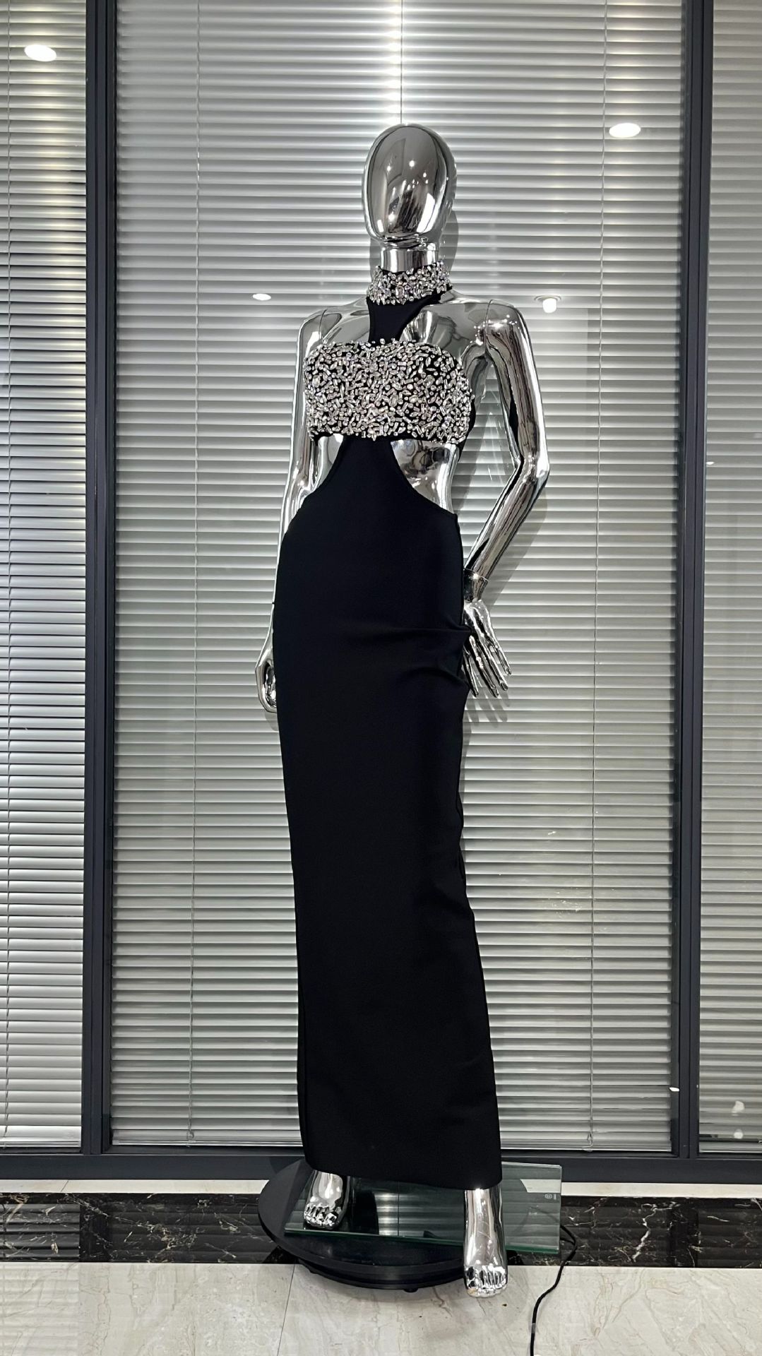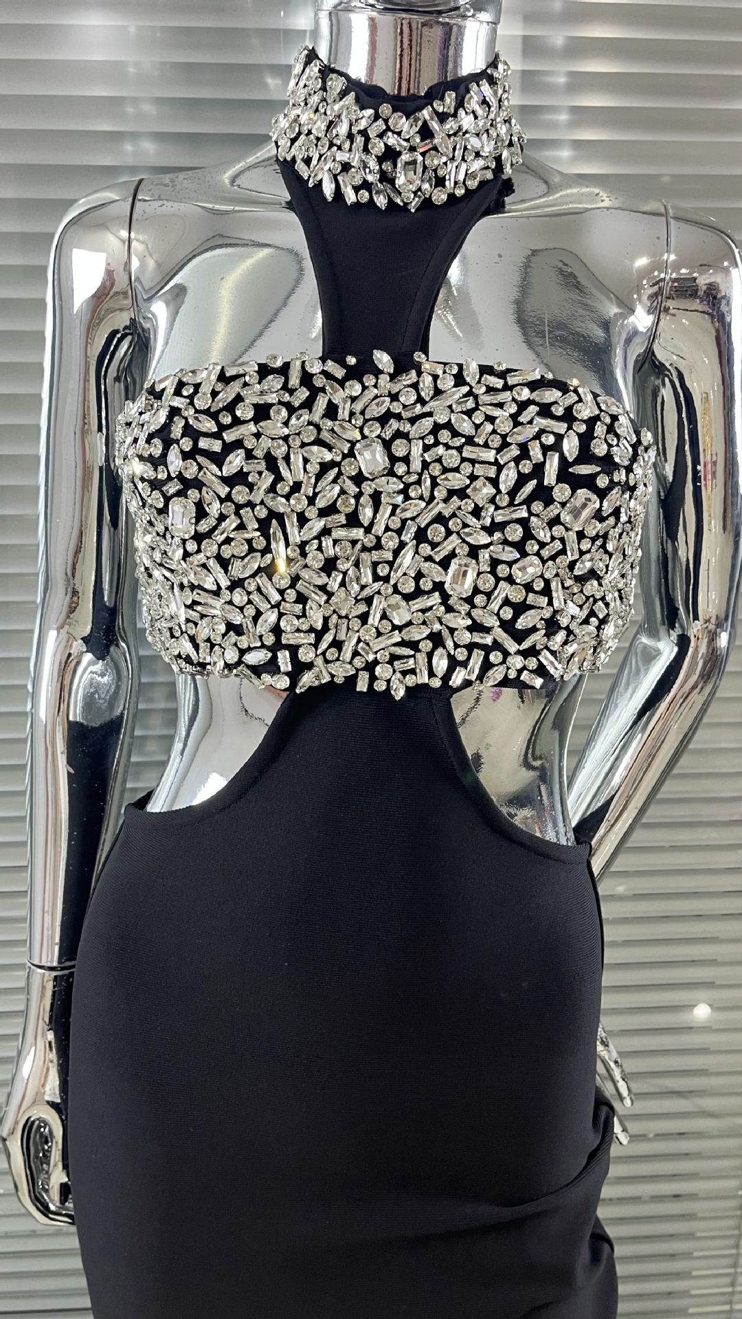 Luxury Rhinestone Fashion Halter Sexy Cutout Black Bandage One-piece Dress