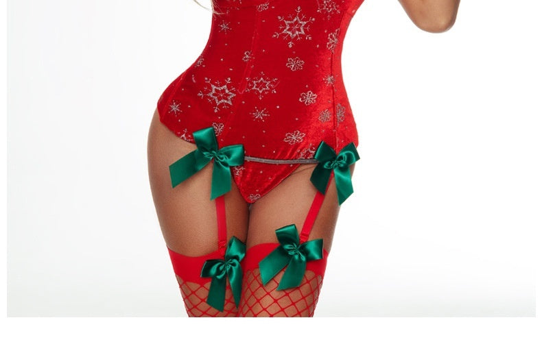 Polyester Red Christmas One-piece Lingerie Uniform Temptation Elk Headdress Jumpsuit