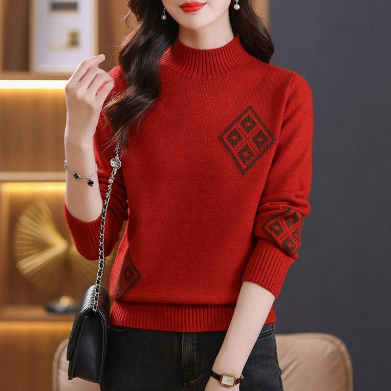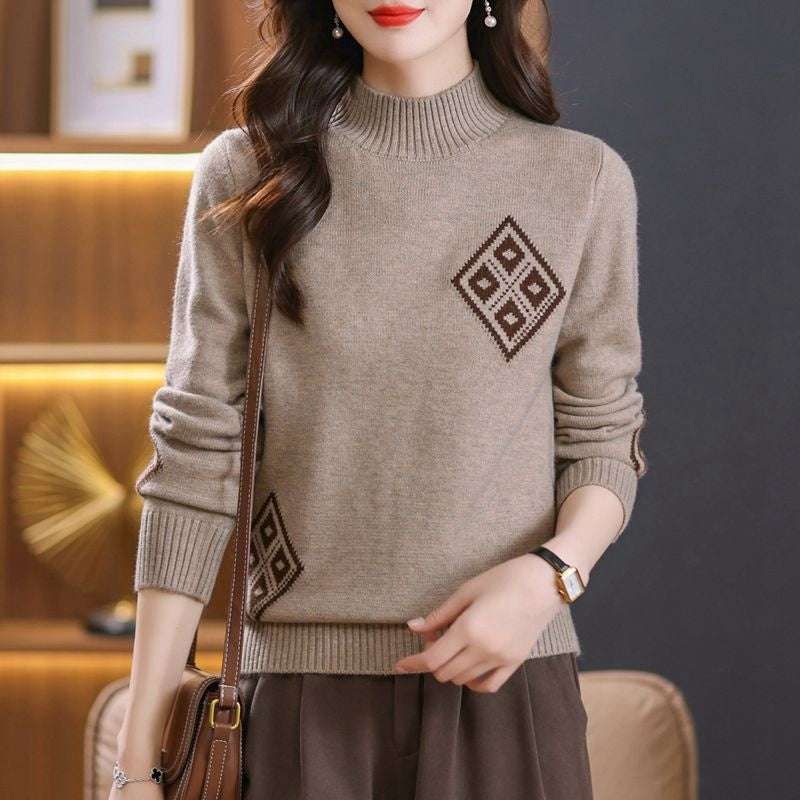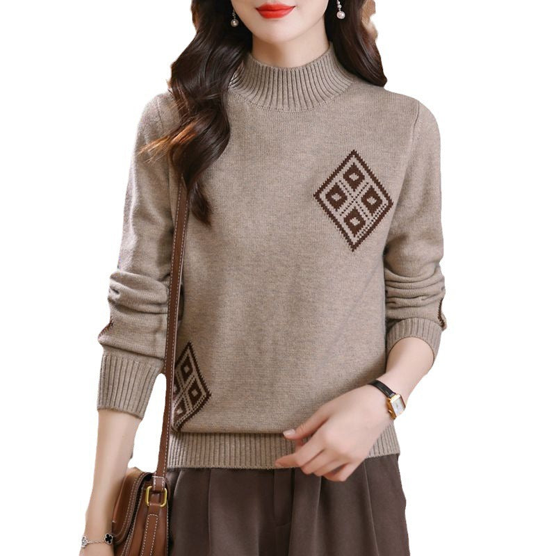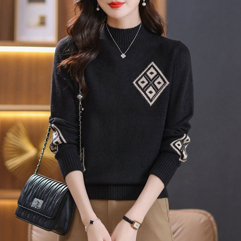 Winter Mock Neck Sweater Women's Western Style Top Plaid Colorblock Knitted